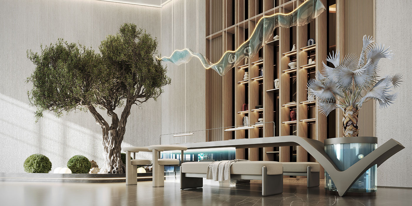 Inspired by nature and modern urban aesthetics, the building seamlessly connects interior spaces with outdoor surroundings. Expansive windows frame open skyline views while allowing sunlight to flow freely into living spaces, creating bright and uplifting environments. This integration of nature and architecture enhances the overall sense of calm, balance, and visual harmony throughout the development.