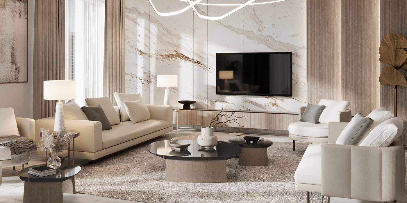 Aeternitas in Dubai Marina stands as an architectural marvel resulting from a unique collaboration. The world's most prestigious watchmakers craft a lifestyle fit for a select few, providing an extraordinary experience. The architect's charm is evident in the common areas, enhancing the beauty of hallways and entrances with an opulent touch. The elegant use of natural marble complements the simplicity of the design, creating a sense of luxury, security, and subtle sophistication.