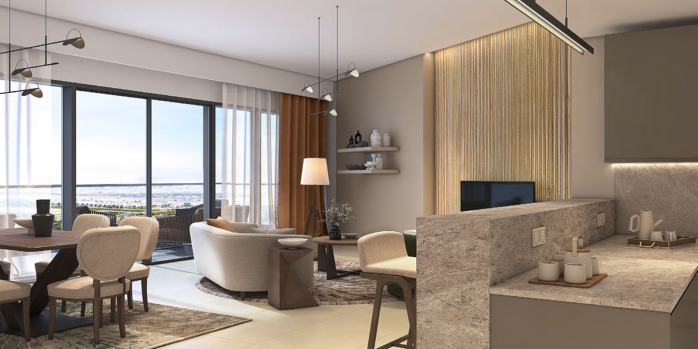 Live a luxury lifestyle at Golf Greens, Damac Hills, where captivating exterior design blends seamlessly with the natural splendour of a world-class golf course. Enter the realm of opulence, where minimalist elegance takes centre stage. Every detail exudes a fresh, modern charm as you watch luxury unfold with elegant architecture. Escape to an ethereal space filled with earthy colours and textures that evoke the beauty of the outdoors, inside.