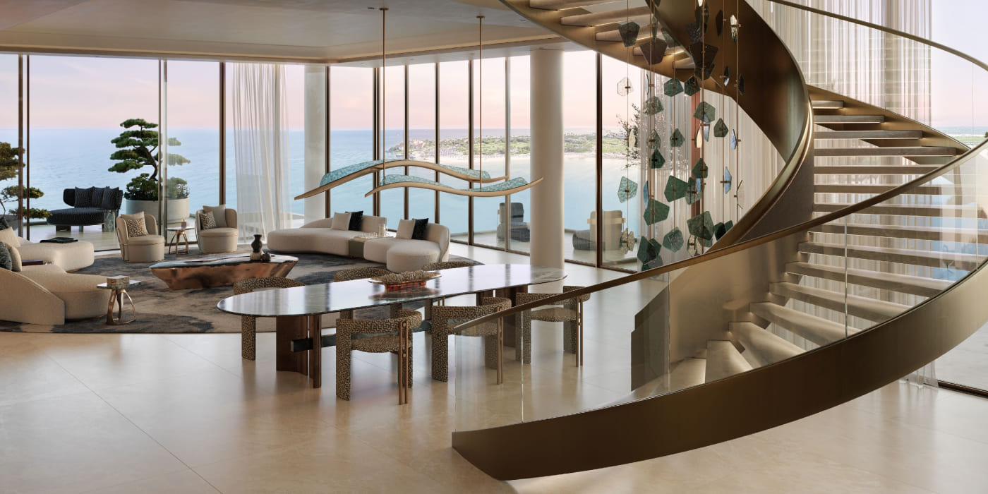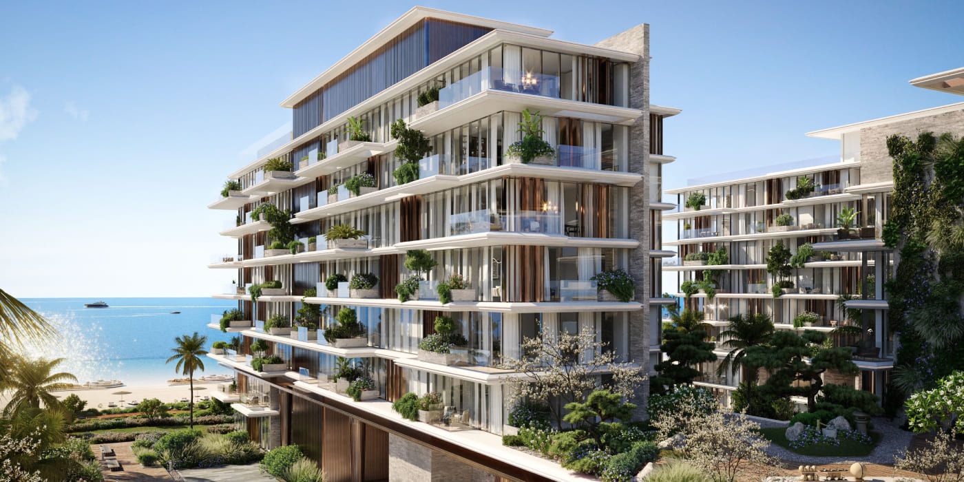 These residences in Dubai Islands rise as three gracefully connected structures, appearing weightless with planes of stone and glass suspended in light. Interiors open seamlessly to the landscape, dissolving the boundaries between nature and design. Every residence—whether an apartment, townhouse, or penthouse—is designed with precision, offering privacy, expansive space, and a direct connection to the sea.