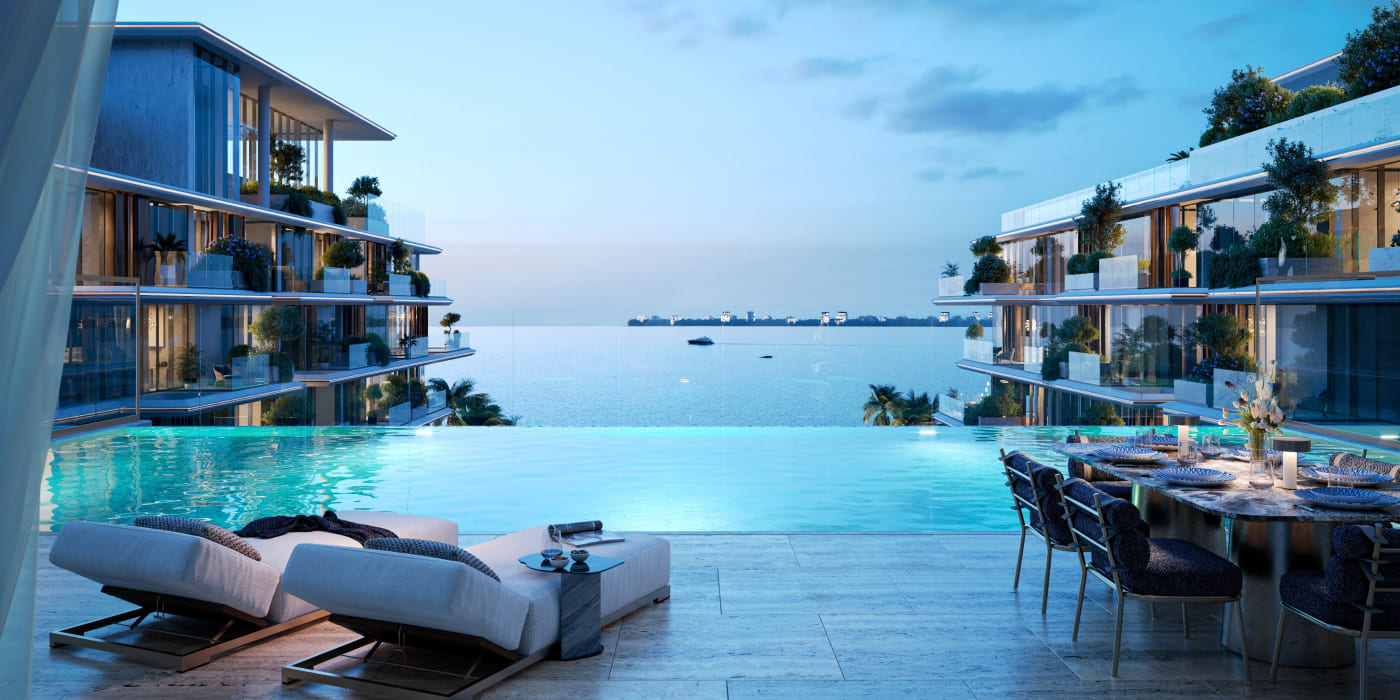 Inside, materials echo the rhythm of water and moonlight. Natural stone, bronzed accents, warm woods, and flowing marbles create a sensory language of calm sophistication. Generous layouts with wide terraces, double-height ceilings, and panoramic openings bring brightness into every corner, while private pools and green courtyards enhance the feeling of retreat.
