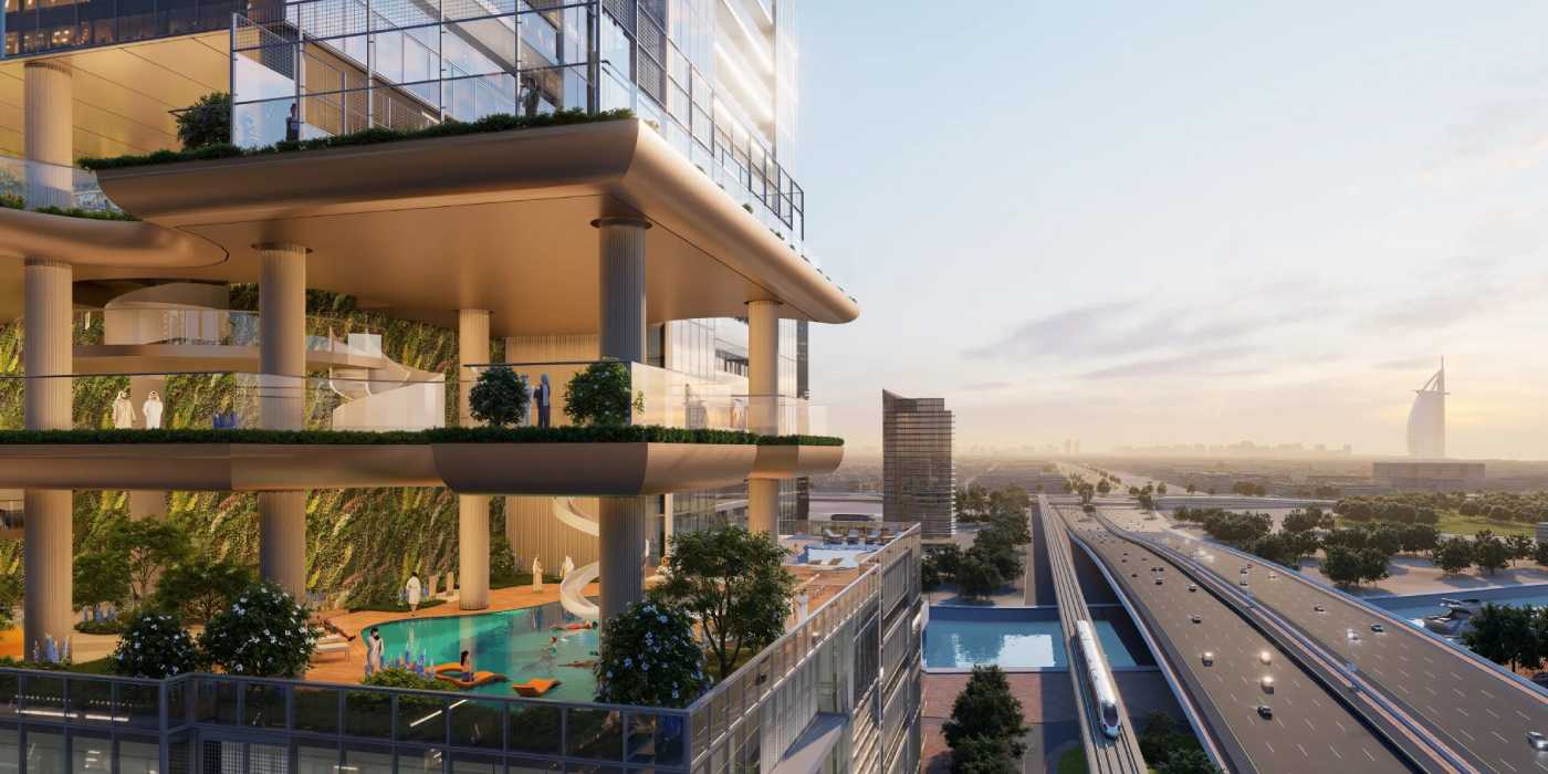 Architecturally, these apartments in Sheikh Zayed Road are characterized by their elegant and sculptural shape. It is designed in such a way that it portrays balance and rhythm with vertical lines that reflect the upward breath of the city. In this airborne building, the building has four great six-story SkyParks that provide a good puncture in the elevation and make it the living lungs that bring greenery, shade, and community to the tower. These elevated parks are not ornamental but are social sanctuaries suspended in the air, combining buildings and landscape to form spaces of encounter, reflection and well-being. The alternating gardens eliminate the verticality of the tower and add natural breaks to the tower, redefining the high-rise living experience.