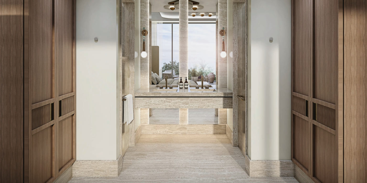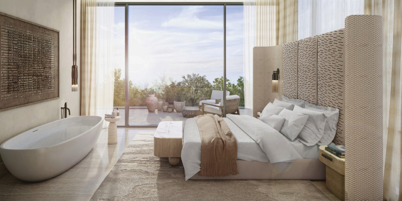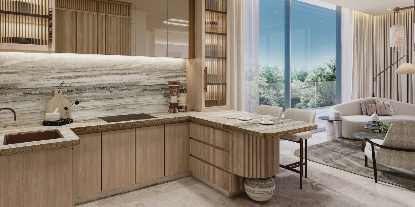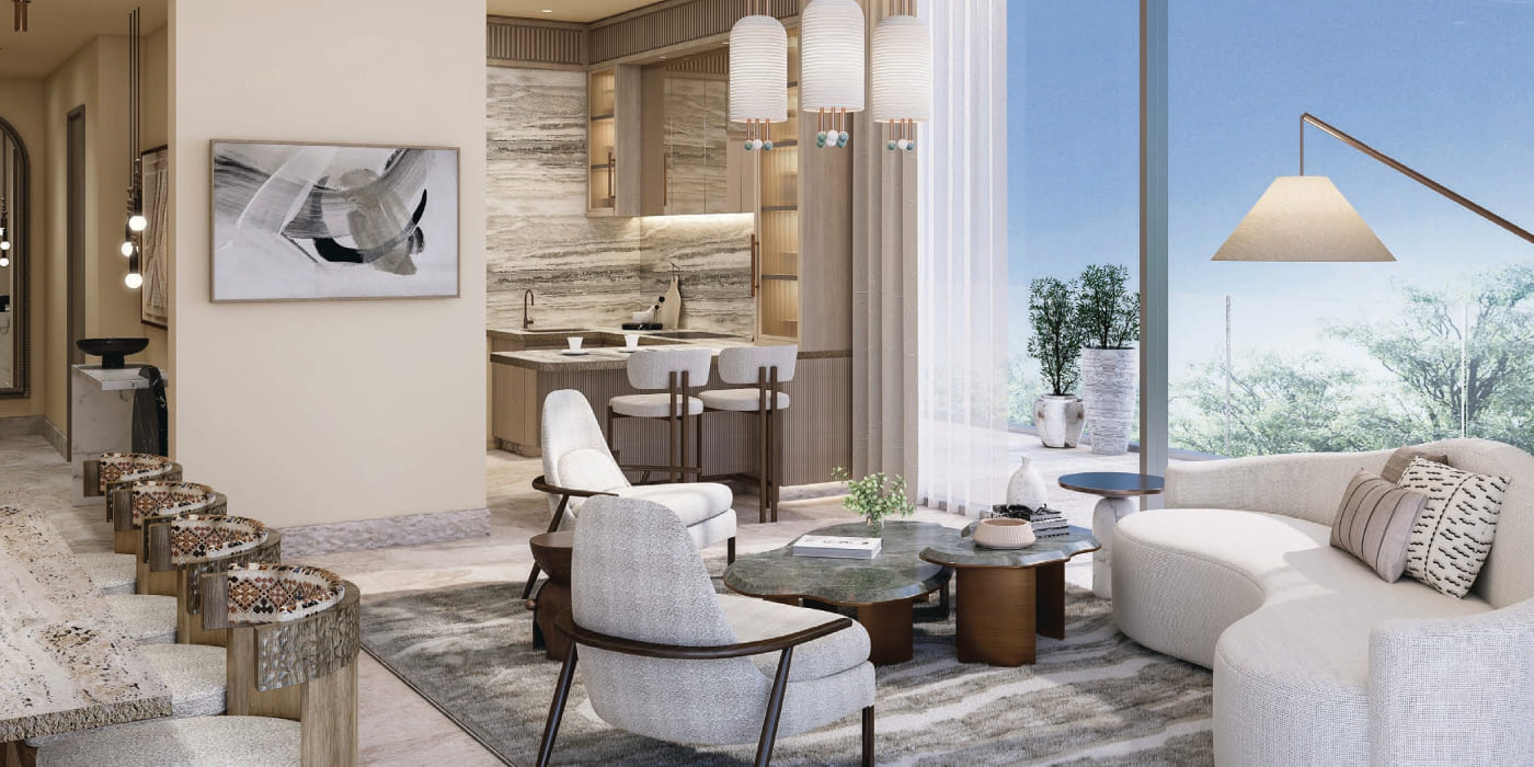 Architecture at Sukoon embodies calmness through proportion, sunlight, and materiality, creating spaces that are open yet intimate. The development is designed by the renowned Bergman Design House, where the shadow, depth and fluctuating light are balanced to create a better impact on the building and provide the residents with privacy and an outdoor space. Thoughtful incorporation of high-quality and sustainable materials is also the guiding force to responsible luxury, which is durable. The ground-level retail has been carefully built to offer convenient lifestyle services without interfering with the peaceful charm of the project.