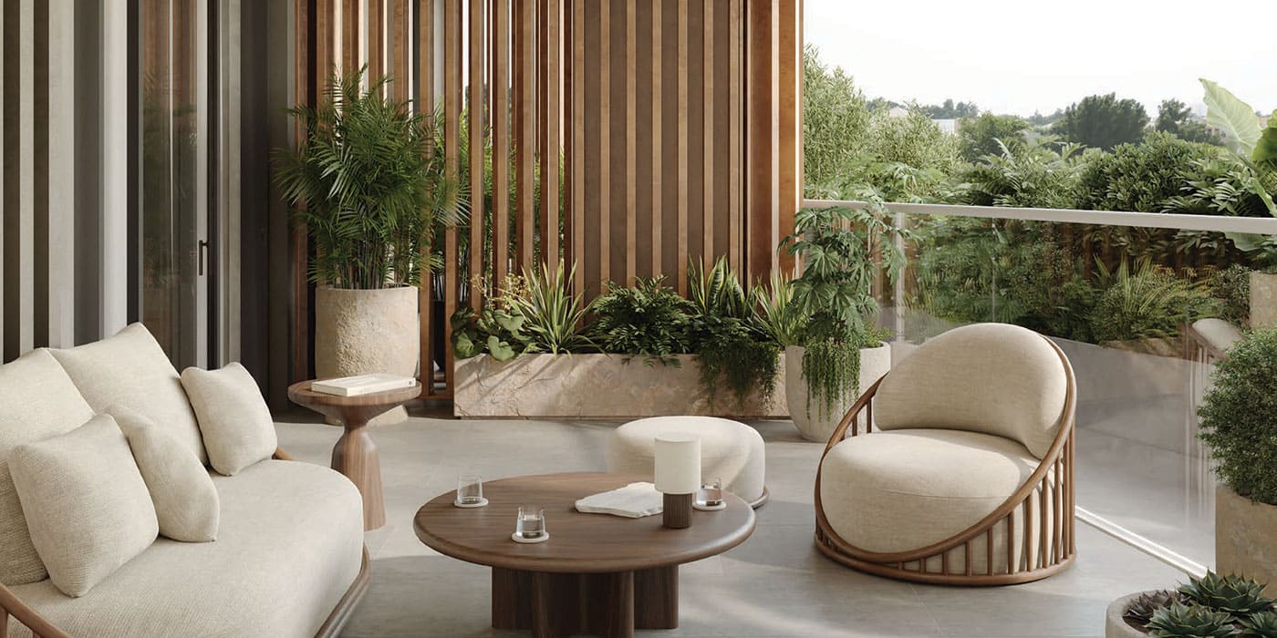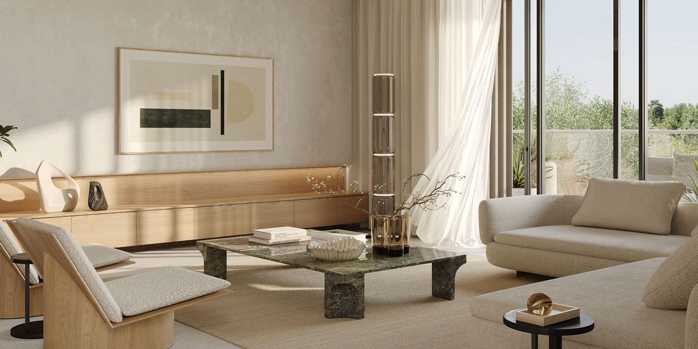 Architecture at these apartments in Al Barari grows organically from its surroundings. The buildings adopt gentle contours, earthy textures, and a palette inspired by the landscape, creating a sense of continuity between the built and natural environments. Spacious layouts, wide terraces, and tactile materials produce interior spaces that feel open, grounded, and intimately connected to the outdoors. Every design choice—from subtle color schemes to fluid circulation—enhances a timeless feeling of ease and natural balance.