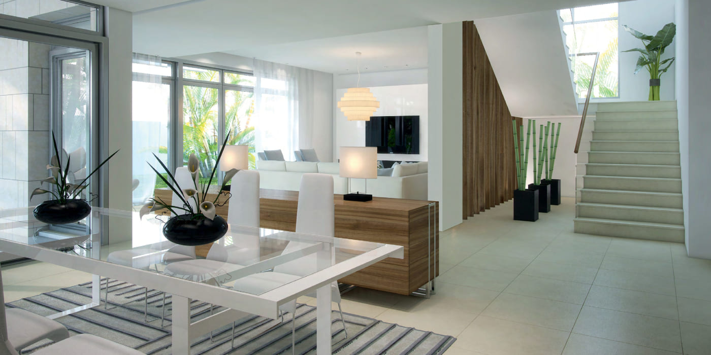 The interiors of these modern villas in Yas Island are a reflection of refined simplicity and elegance. Smooth tiled floors, soft neutral tones, and immaculate finishes create a bright and airy ambience throughout the living spaces. Expansive living and dining areas open seamlessly to modern kitchens, encouraging family gatherings and entertaining. The upper floors host spacious master suites featuring large windows, high ceilings, and calming views that enhance privacy and relaxation. Every detail, from layout to lighting, is curated for comfort and aesthetic balance.